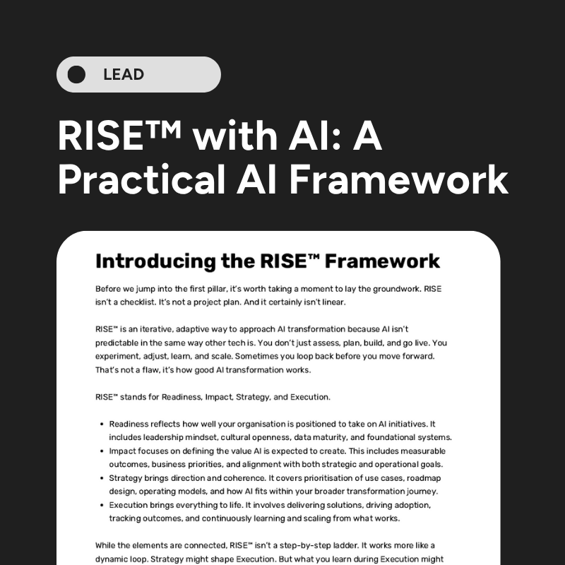 RISE™ with AI is a hands-on framework for enterprise AI adoption. Designed by Aamir Qutub, it helps organisations move from scattered pilots to scalable impact using four key pillars: Readiness, Impact, Strategy, and Execution. The paper cuts through AI buzzwords to deliver real-world advice on aligning teams, defining value, and building solutions that stick.